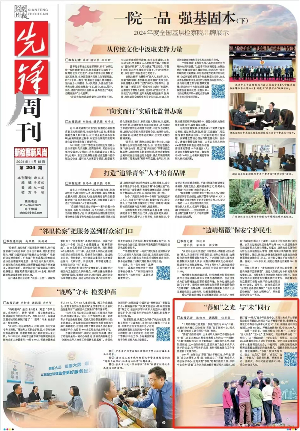 2024年11月15日,《检察日报》第5版“先锋周刊”刊登2024年度全国基层检察院品牌《“莎姐”之光 与“未”同行》一文,内容如下: