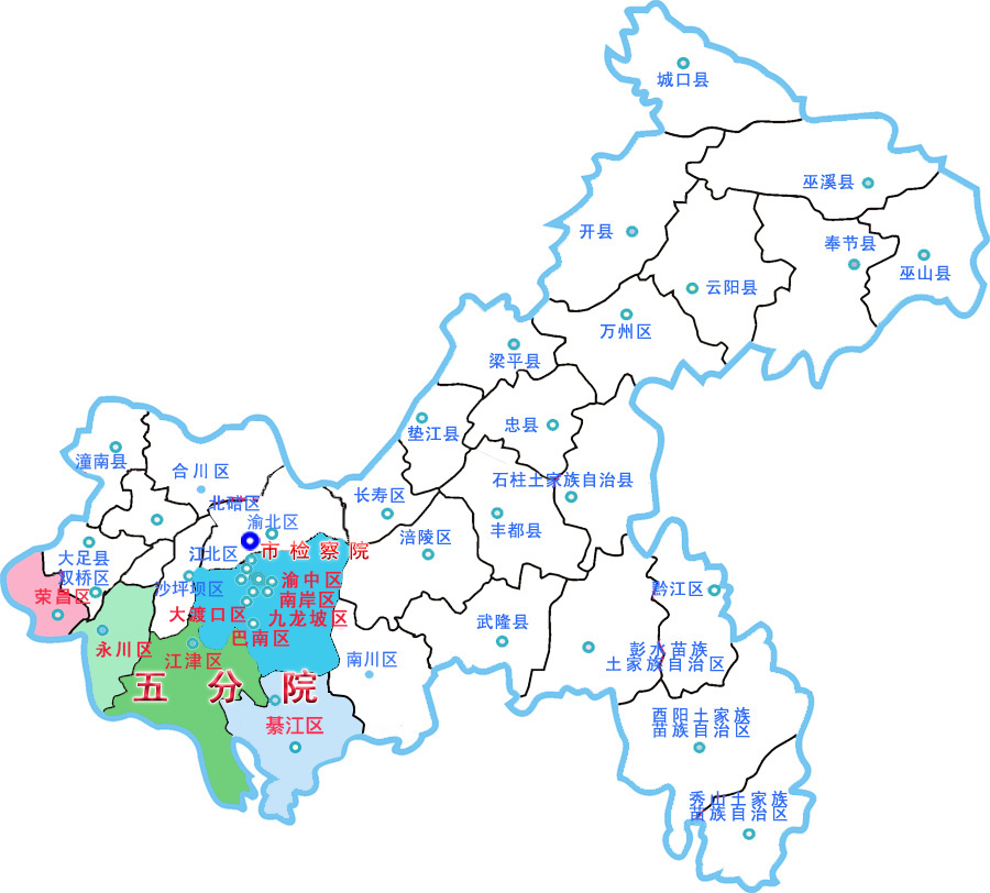 根据2008年重庆市委编办、188体育(中国)官方网站 关于全市监狱检察管辖体制调整的决定,188体育(中国)官方网站 第五分院统一对重庆市渝都监狱、大坪监狱、九龙监狱、女子监狱、长康监狱、永川监狱、渝西监狱及市看守所等8个监管场所履行检察监督职责。
