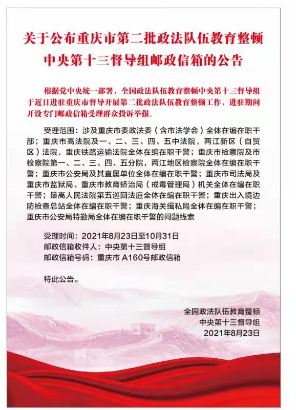 关于公布重庆市第二批政法队伍教育整顿中央第十三督导组邮政信箱的公告