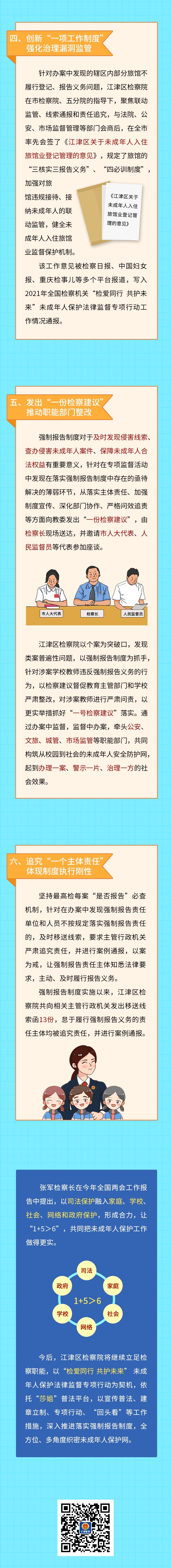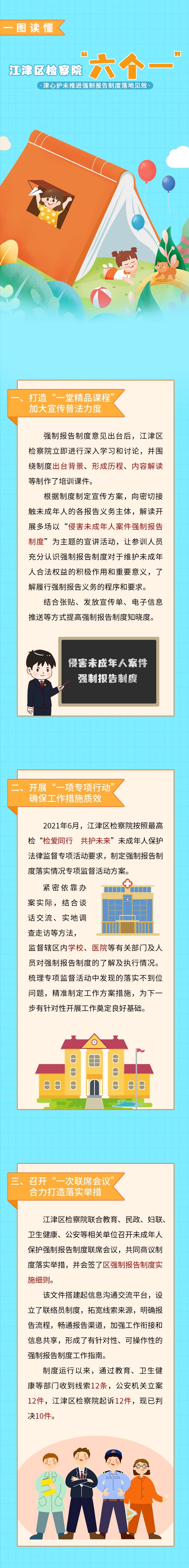 为落实最高检等九部门联合印发《关于建立侵害未成年人案件强制报告制度的意见(试行)》要求,根据188体育(中国)官方网站 等九部门联合出台的强制报告制度实施办法,江津区检察院充分发挥检察职能,强化未成年人综合司法保护,以“六个一”工作措施为主线,推动侵害未成年人案件强制报告制度落实见效。