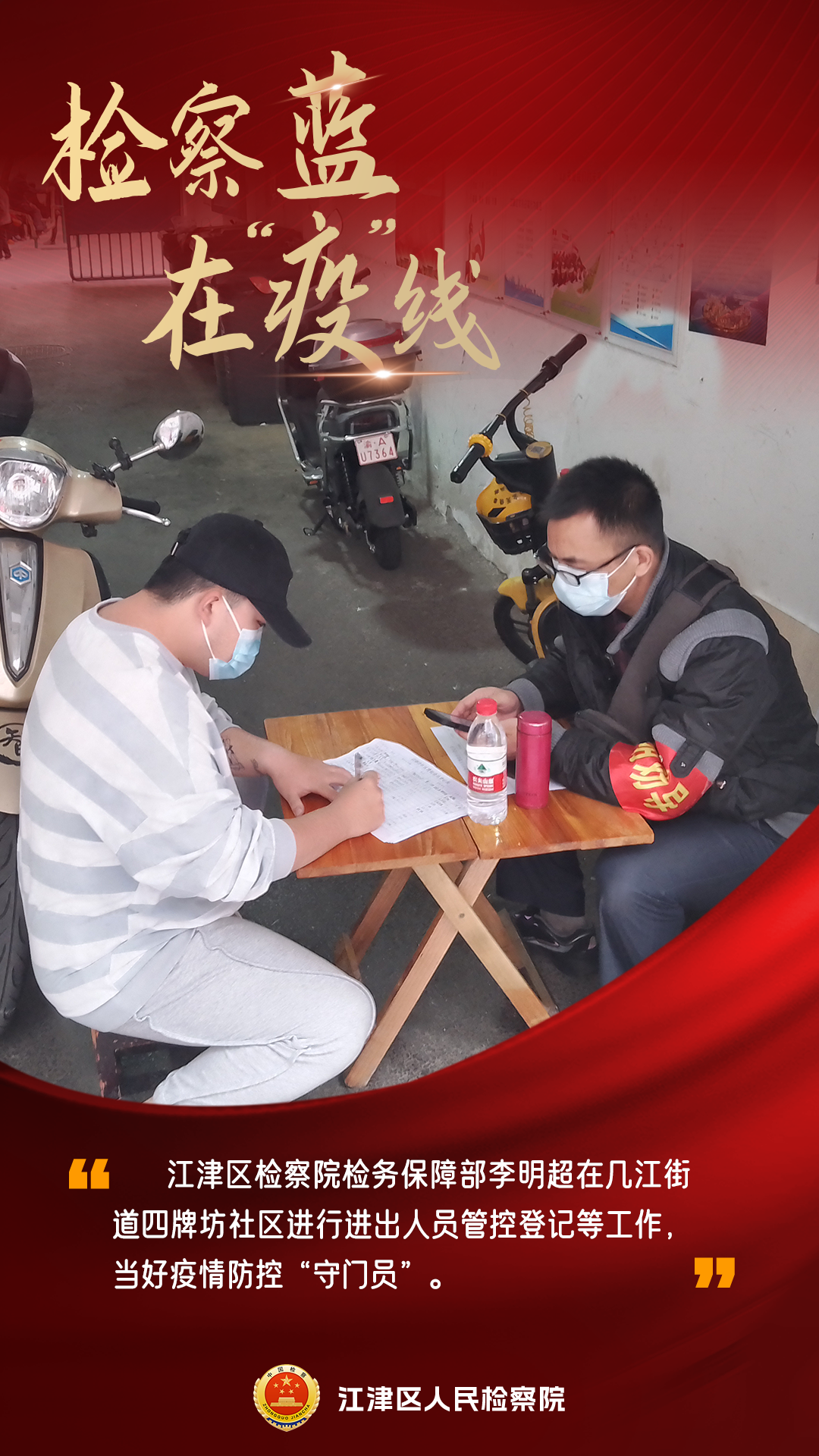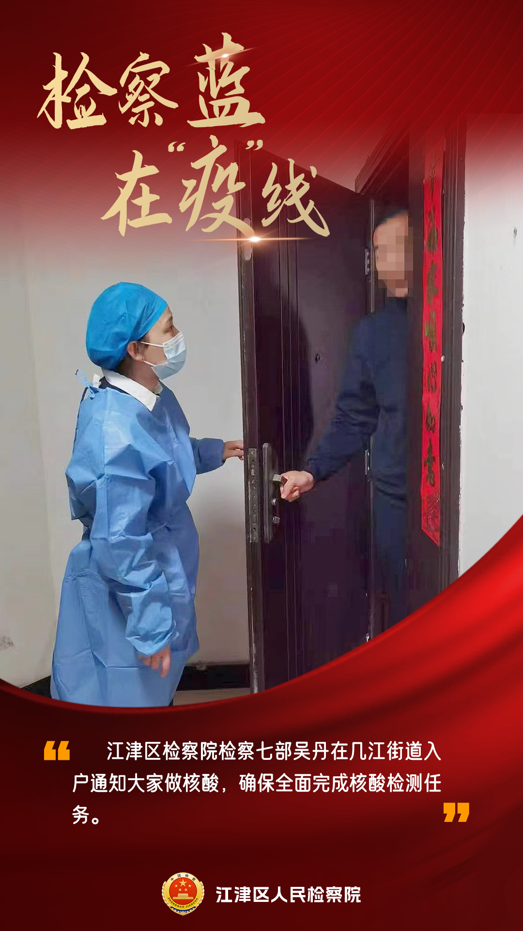 截止目前,江津区检察院居家办公干部职工下沉到辖区内22个社区、65个小区疫情防控工作一线,开展志愿服务445人次,配合社区工作人员认真做好核酸检测秩序维护、重点人员摸排、志愿服务等各项工作,确保核酸检测工作有序开展,为打赢疫情防控歼灭战贡献检察力量。