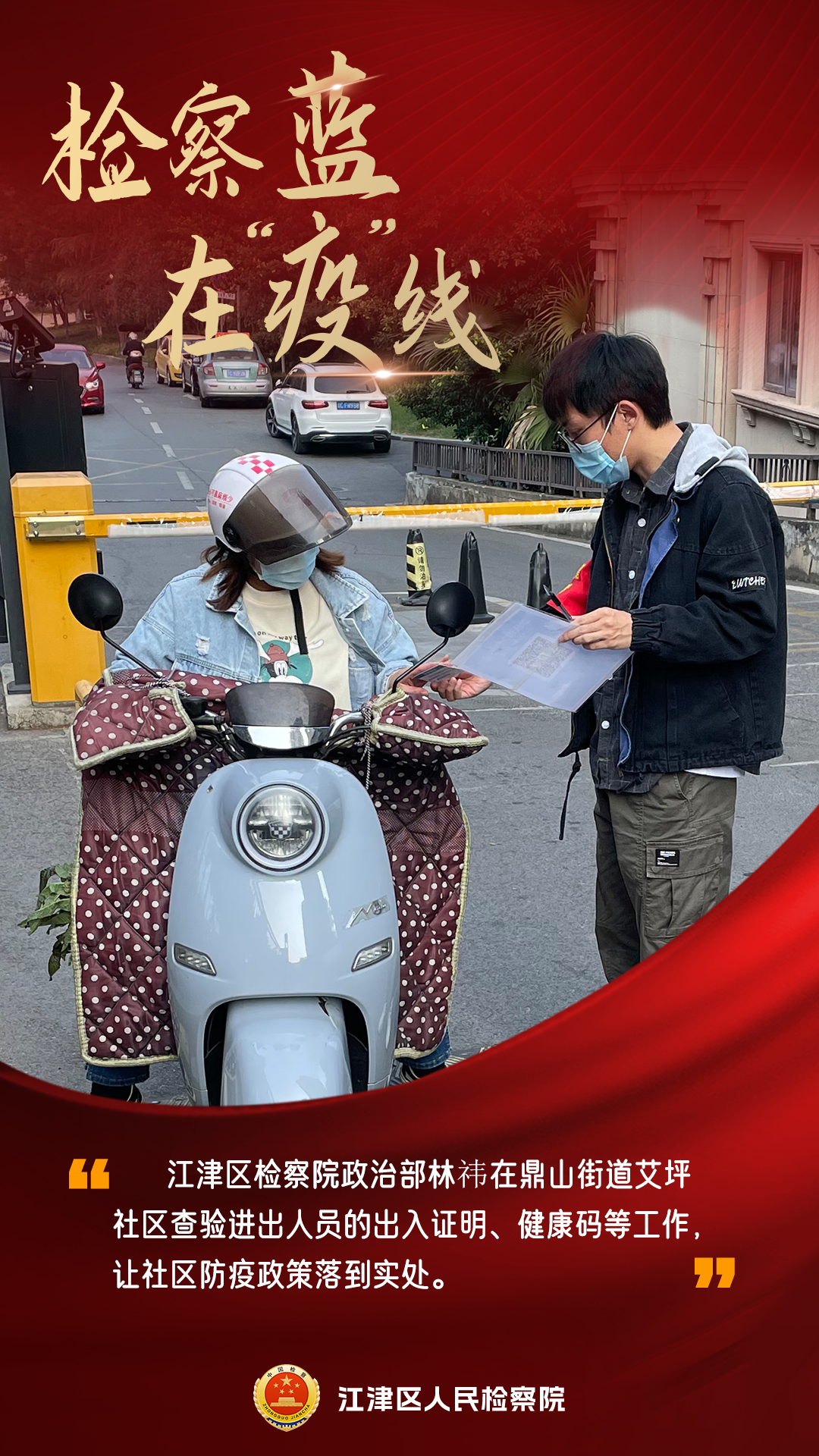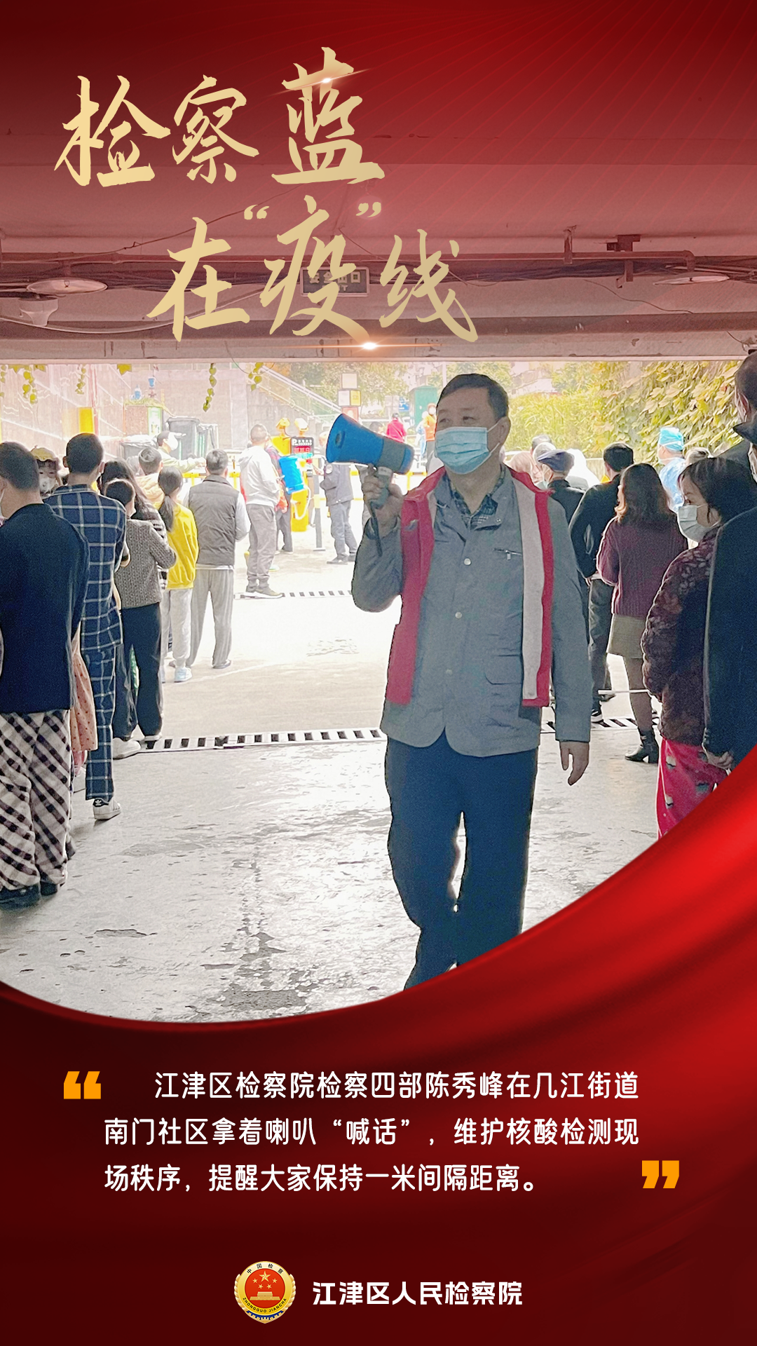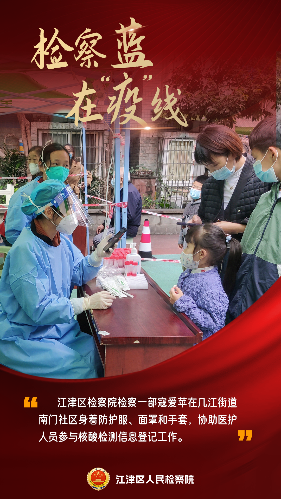 截止目前,江津区检察院居家办公干部职工下沉到辖区内22个社区、65个小区疫情防控工作一线,开展志愿服务445人次,配合社区工作人员认真做好核酸检测秩序维护、重点人员摸排、志愿服务等各项工作,确保核酸检测工作有序开展,为打赢疫情防控歼灭战贡献检察力量。