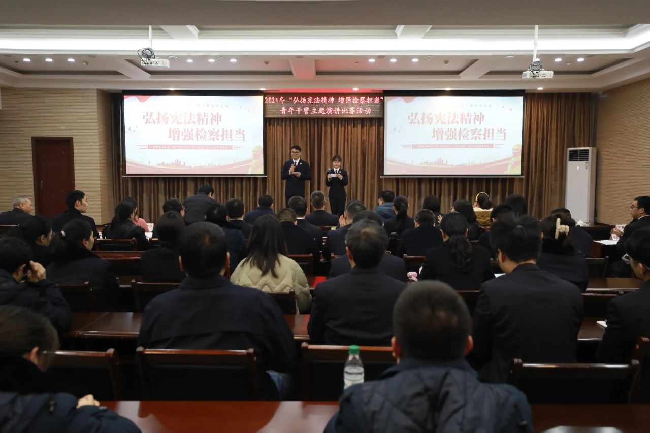2024年12月4日,在第11个国家宪法日当天,江津区检察院以“弘扬宪法精神 增强检察担当”为主题组织青年干警开展演讲比赛,磨砺青年干警综合素养,提升队伍履职能力。188体育 、188体育 五分院、区委组织部、区委政法委、团区委、区融媒体中心相关领导莅临活动现场给予指导。院党组领导班子、全体干警全程观看了比赛。