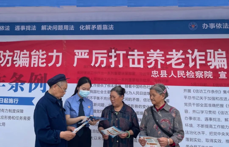 “嬢嬢,企业代缴养老保险是骗局,我们本地就有老人上当,你们千万不要相信。”8月10日,忠县检察院干警深入当地社区,为老人们普及养老反诈知识。他们选择以该县首例公开宣判的涉养老诈骗案件为例,以身边案警醒身边人。