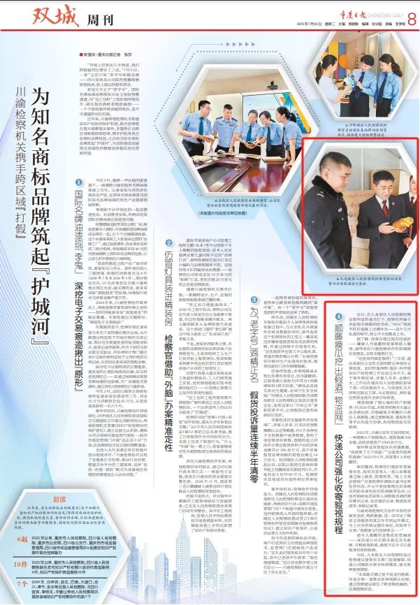 2025年7月22日,《重庆日报》第8版 “双城周刊”整版刊登《川渝检察机关携手跨区域“打假”——为知名商标品牌筑起“护城河”》一文,其中对九龙坡区检察院依托川渝检察协作机制全链条打击制售假酒犯罪进行了报道,内容如下: