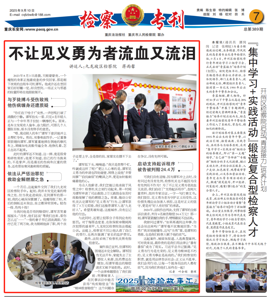 2025年9月10日,《重庆法治报》第7版“渝检故事汇”专栏刊登《不让见义勇为者流血又流泪》一文,内容如下: