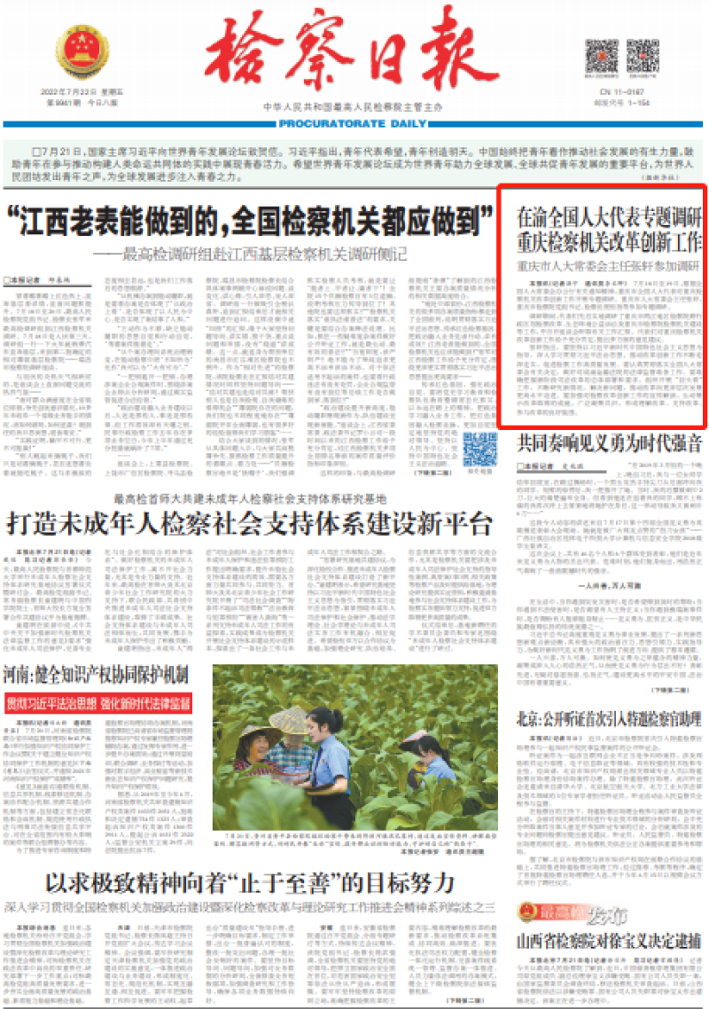 2022年7月22日,《检察日报》头版刊登《在渝全国人大代表专题调研188体育