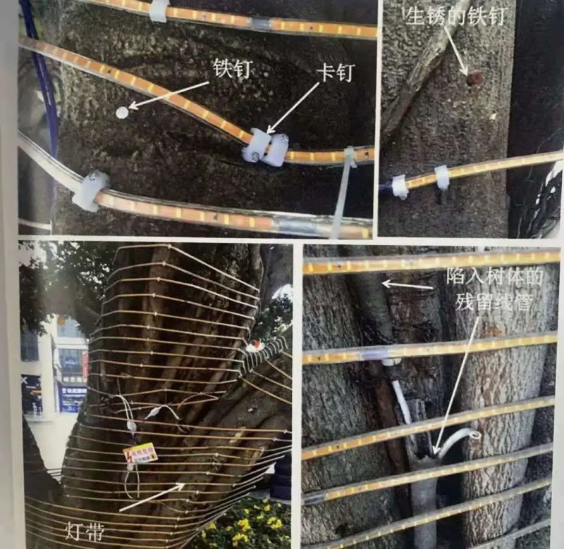 经调查取证和向林业专家咨询,检察官们了解到,古树是指树龄在100年以上的树木,根据相关法律规定,在古树上刻划、张贴或者悬挂物品是《城市古树名木保护管理办法》明确禁止的行为。以损害树体的方式设置夜景灯饰不仅影响古树的正常生长、观赏价值,而且会诱发安全隐患。