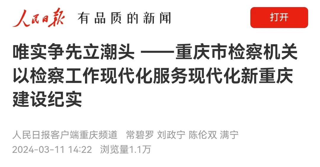 2024年3月11日,人民日报客户端刊登《唯实争先立潮头——188体育 机关以检察工作现代化服务现代化新重庆建设纪实》,内容如下:
