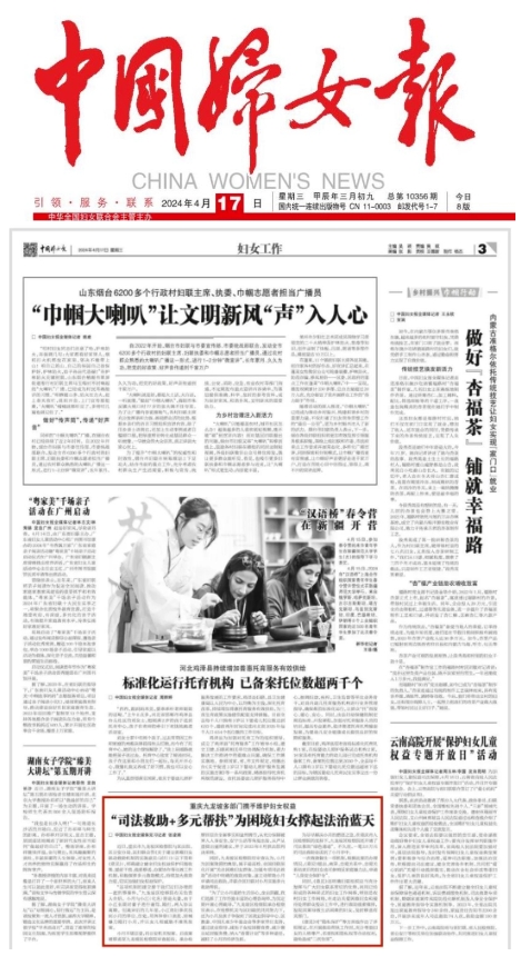 2024年4月17日,《中国妇女报》第3版刊登《重庆九龙坡多部门携手维护妇女权益 “司法救助+多元帮扶”为困境妇女撑起法治蓝天》一文,内容如下: