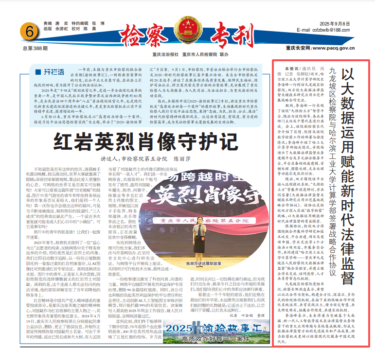 2025年9月8日,《重庆法治报》第6版刊登《以大数据运用赋能新时代法律监督——九龙坡区检察院与哈尔滨工业大学计算学部签署战略合作协议》一文,内容如下: