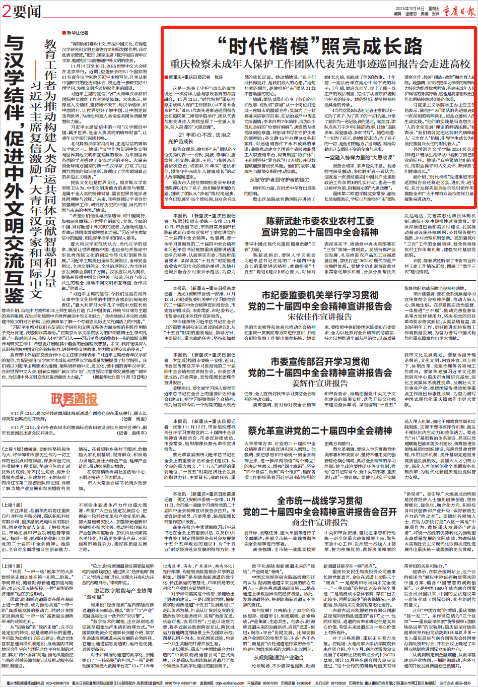 2025年11月14日,《重庆日报》第2版刊登《“时代楷模”照亮成长路——188体育 未成年人保护工作团队代表先进事迹巡回报告会走进高校》一文,内容如下:
