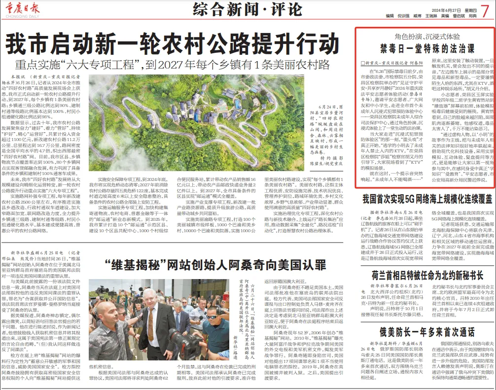 “6.26”国际禁毒日,市委政法委,188体育 五分院、荣昌区检察院开展“见证守护平安·共享岁月静好” 2024年重庆政法平安志愿者体验活动。微信视频号、腾讯新闻、抖音进行专场直播,累计线上观看人数302万人次,中国新闻网、法治日报、重庆日报、上游新闻、重庆长安网、重庆法治报、华龙网等7家中央及省级媒体集中进行了报道,内容如下: