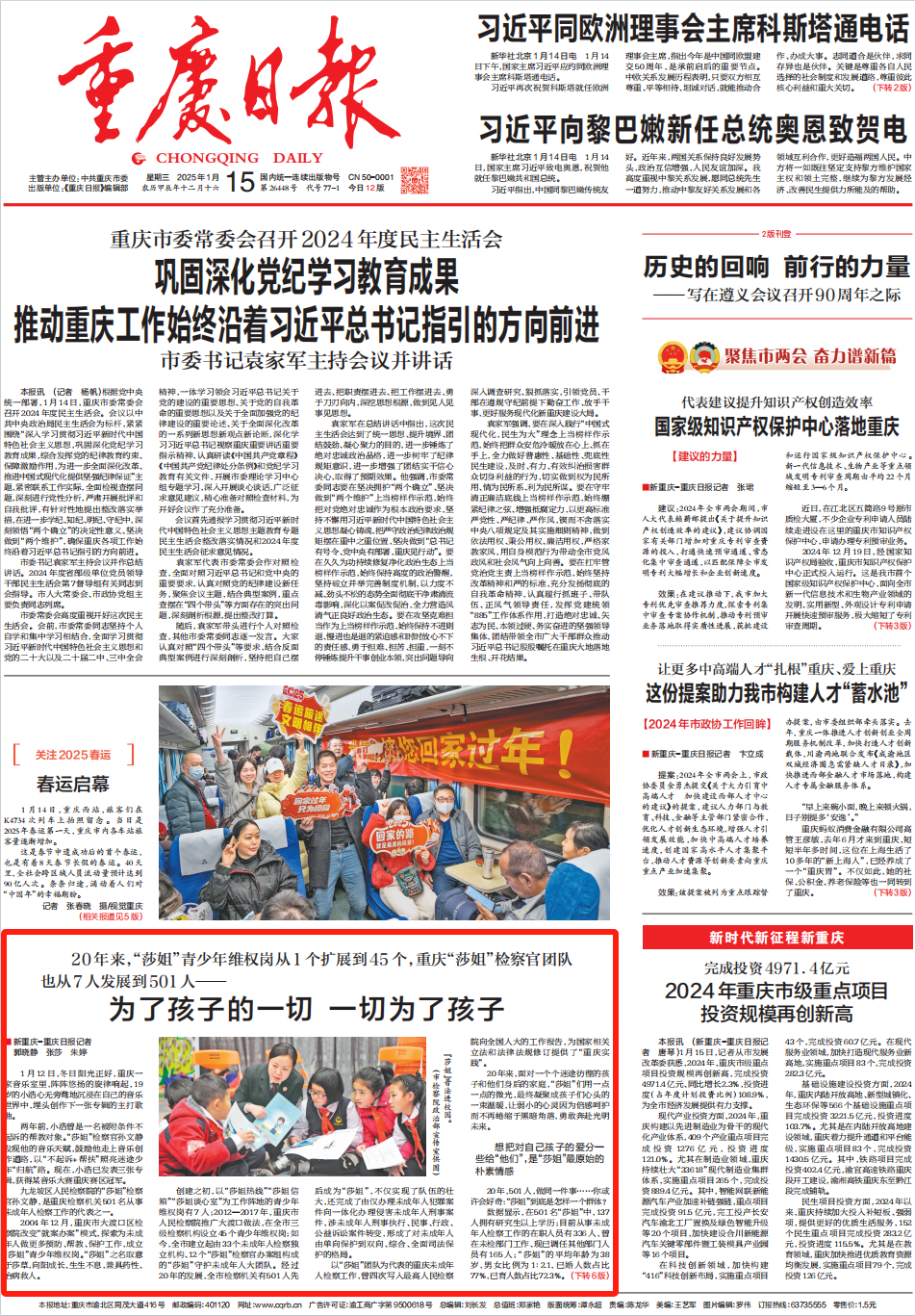 2025年1月15日,《重庆日报》头版转第6版整版刊登《为了孩子的一切 一切为了孩子》一文,内容如下: