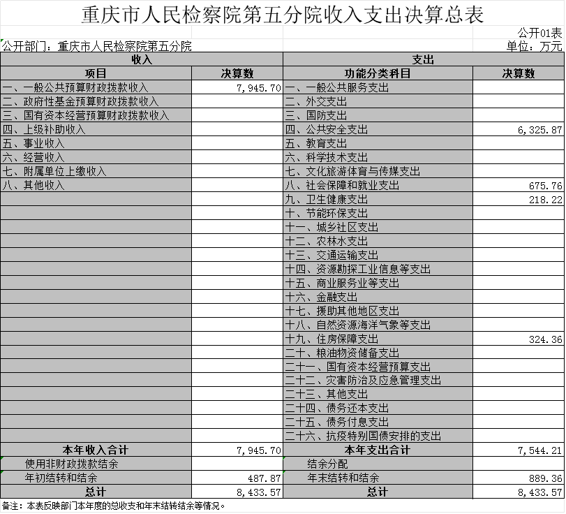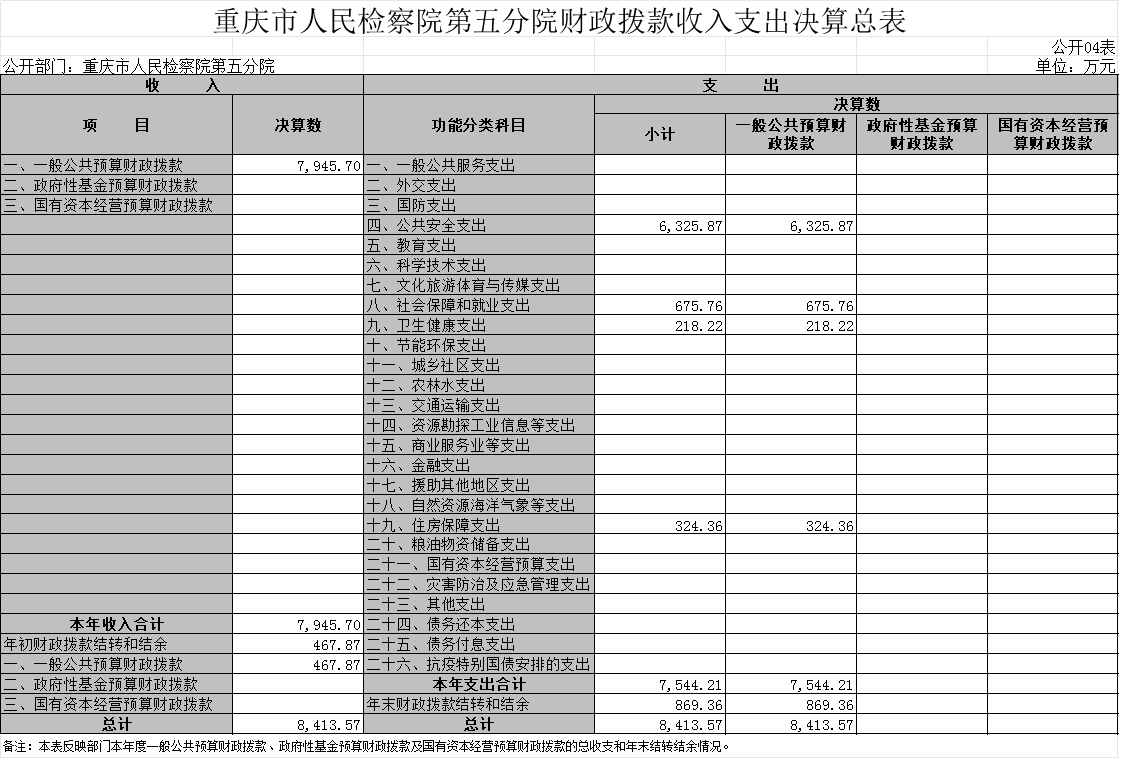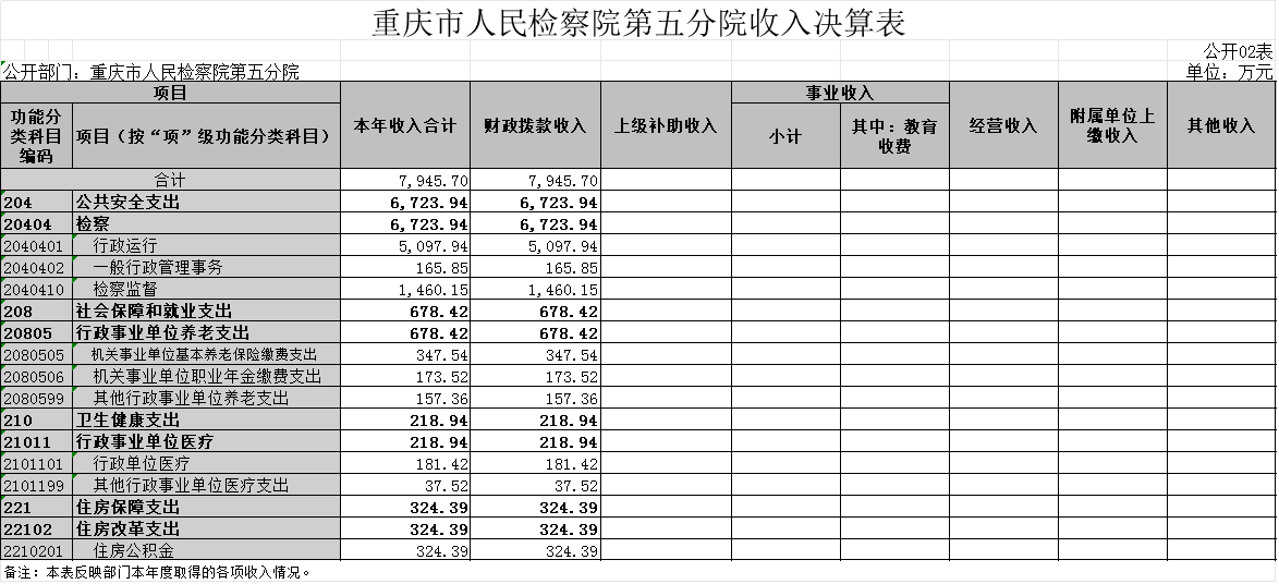 1.收入情况。2022年度一般公共预算财政拨款收入7,945.70万元,较上年决算数减少2,048.42万元,下降20.5%。主要原因是本年减少办公楼信息化建设一次性项目收入,公用经费综合定额年中人均追减1万元。较年初预算数增加1,083.98万元,增长15.8%。主要原因是年度中追加司法救助金、2021年考核奖、住房公积金及社保缴费指标。此外,年初财政拨款结转和结余467.87万元。