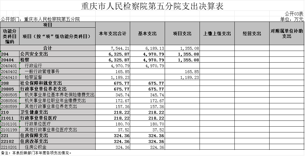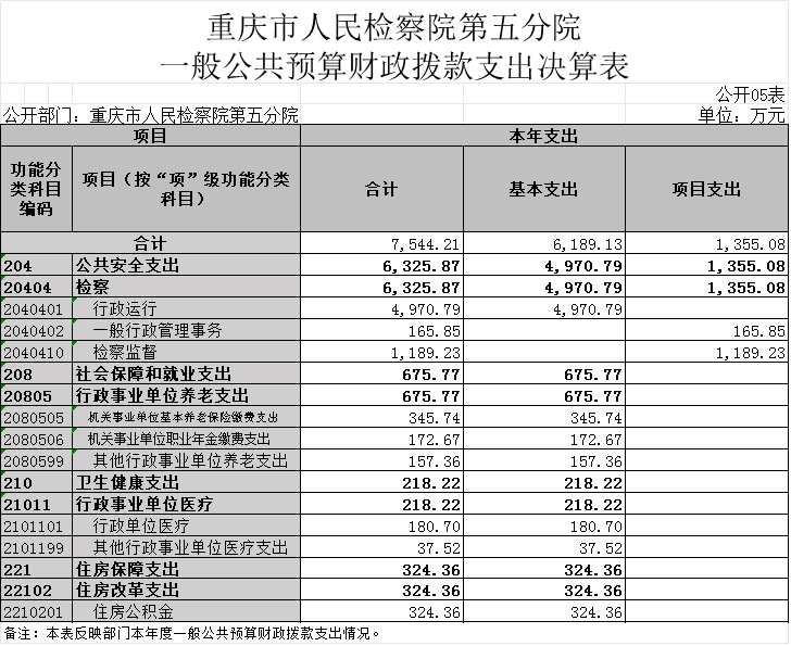 2.支出情况。2022年度一般公共预算财政拨款支出7,544.21万元,较上年决算数减少2,216.92万元,下降22.7%。主要原因是一是落实过“紧日子”的要求,严控公用及项目经费开支、二是本年减少办公楼信息化建设一次性项目支出。较年初预算数增加682.49万元,增长9.9%。主要原因是支付年度中追加的司法救助金、2021年考核奖、住房公积金及社保缴费,以及有序消化年初结转结余。