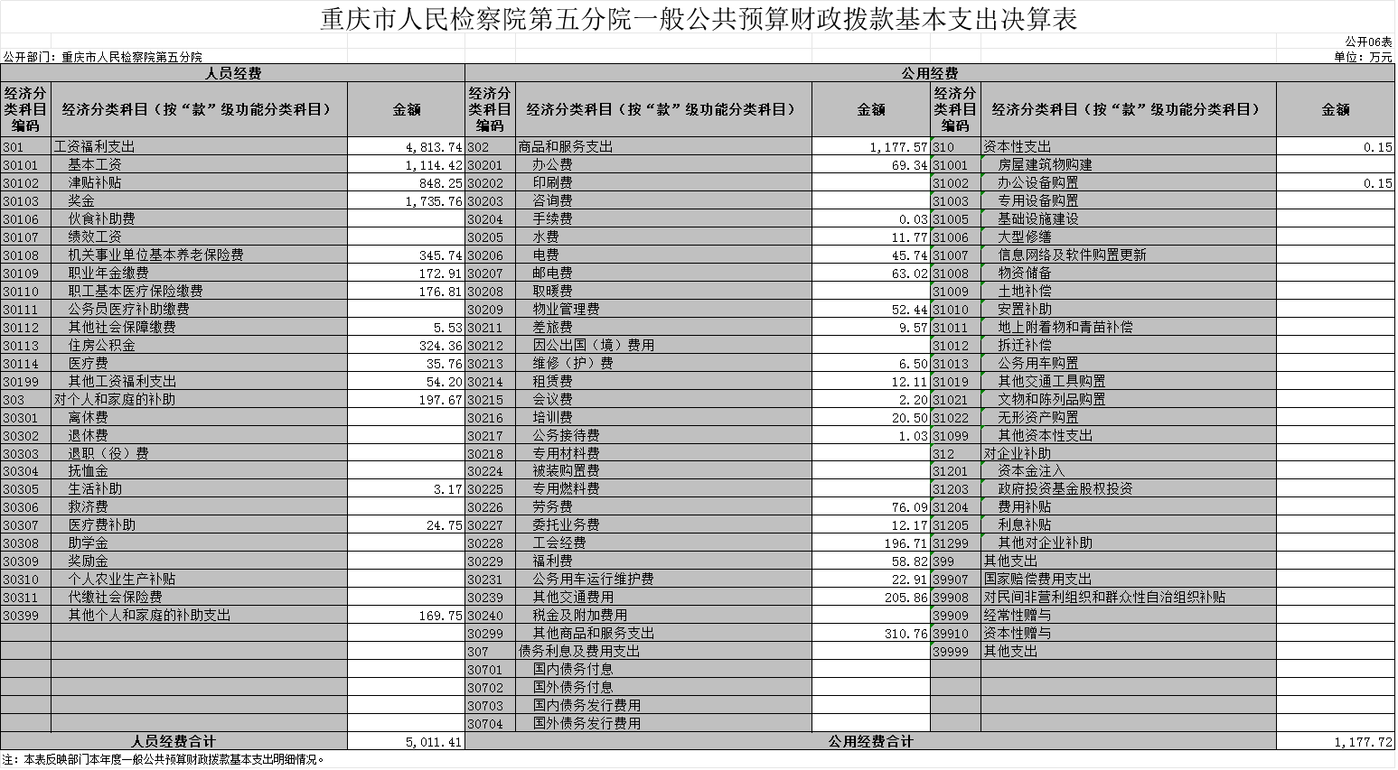 2022年度一般公共财政拨款基本支出6,189.13万元。其中:人员经费5,011.41万元,较上年决算数减少300.96万元,下降5.7%,主要原因是规范公务员津贴补贴改革后,追减平时考核奖、年终一次性奖金、未休假补贴等。人员经费用途主要包括基本工资、津贴补贴、奖金、社会保障缴费及其他工资福利支出。公用经费1,177.72万元,较上年决算数增加268.08万元,增长29.5%,主要原因是本年我院搬入新办公楼,物业管理费、水电费等机关运行费用增加。公用经费用途主要包括办公及印刷费、邮电费、差旅费、会议费、福利费、日常维护费、办公用房水电费、物业管理费、公务用车运行维护费以及其他费用。