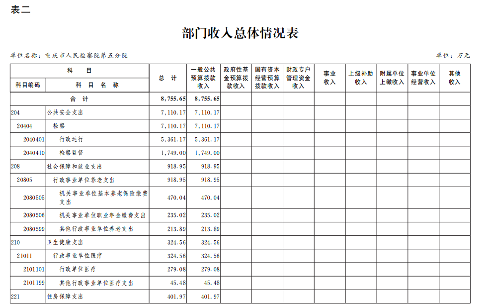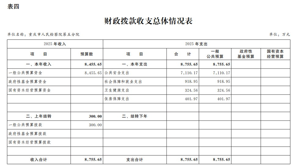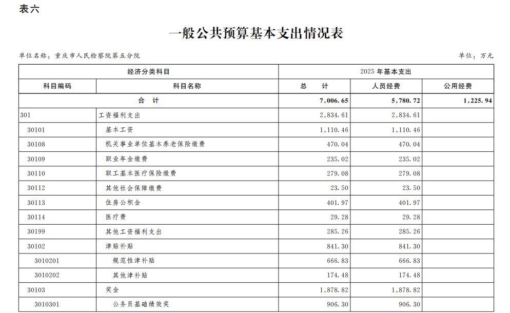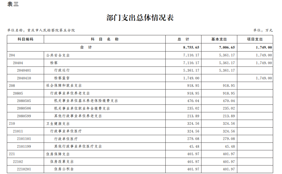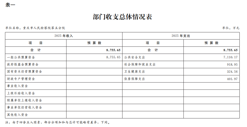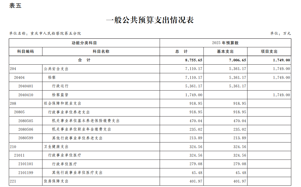 2025年一般公共预算财政拨款收入8,755.65万元,一般公共预算财政拨款支出8,755.65万元,比2024年增加509.04万元。其中:基本支出7,006.65万元,主要用于保障在职人员工资福利及社会保险缴费、退休人员补助等,保障部门正常运转的各项商品服务支出,比2024年增加154.04万元,主要原因是退休及在职人数增加,人员及公用经费预算相应增加;项目支出1,749万元,主要用于刑事检察、民事检察、行政检察和公益诉讼检察等重点工作,比2024年增加355万元,主要原因一是本年新增成渝金融检察部办案费及一次性项目经费,二是结转收入较上年有所增加。