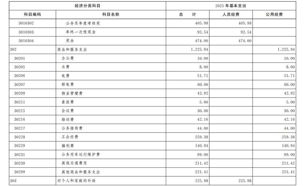 (一)机关运行经费。2025年一般公共预算财政拨款运行经费1,221.83万元,比2024年增加39.94万元,主要原因为在职人数增加;主要用于办公费、邮电费、水电费、物管费、差旅费、会议费、培训费及其他商品和服务支出等。