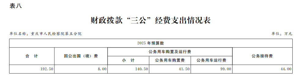 2025年“三公”经费预算192.5万元,与上年持平。其中:因公出国(境)费用8万元,与上年持平;公务接待费44万元,与上年持平;公务用车运行维护费99万元,与上年持平;公务用车购置费41.5万元,与上年持平。