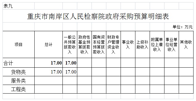 2.政府采购情况。本单位政府采购预算总额17万元,其中:政府采购货物预算17万元。一般公共预算拨款政府采购17万元,其中:政府采购货物预算17万元。