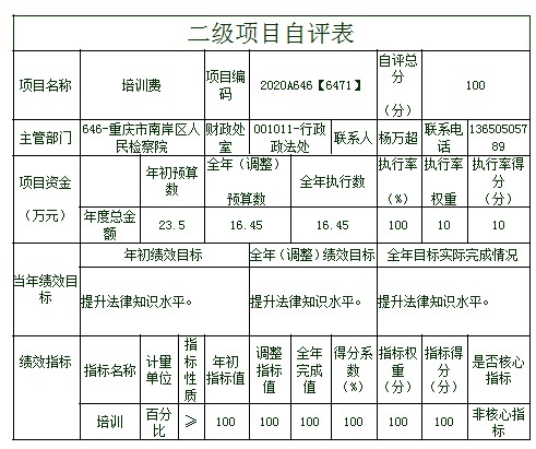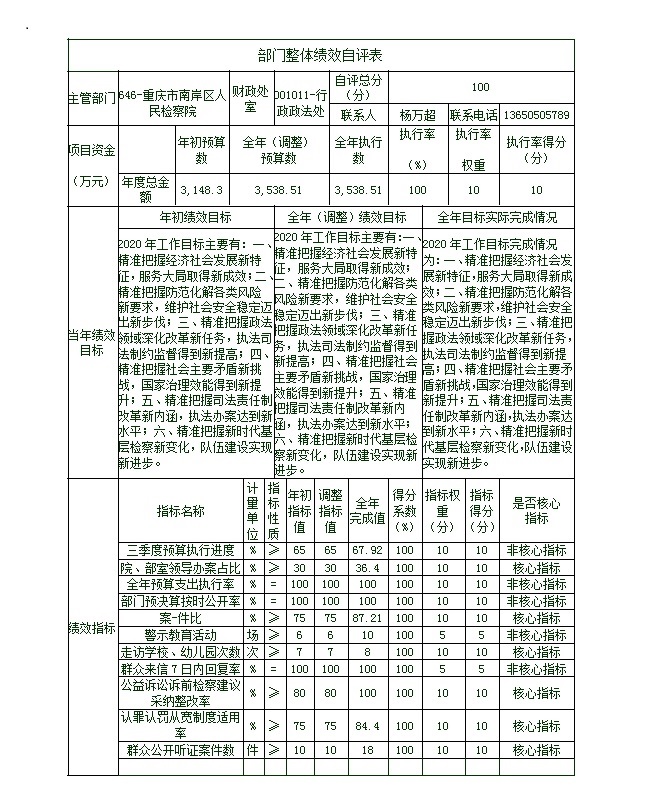 根据预算绩效管理要求,本部门对5个项目开展了绩效自评,其中,以填报目标自评表形式开展自评1项,涉及资金453万元;从评价情况来看,圆满完成2020年年初预算安排,有效办理了黑恶犯罪、民事监督、公益诉讼等案件,维护了本辖区的社会经济秩序。