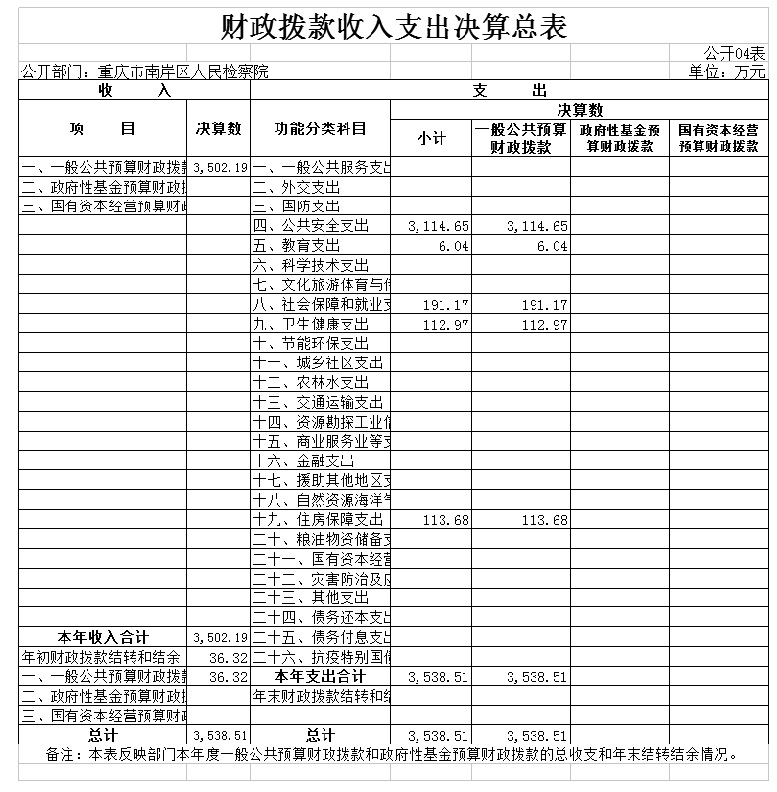 2020 年度财政拨款收、支总计3,538.51万元。与2019年相比,财政拨款收、支总计各减少498.11万 元,下降12.34%。主要原因是监察体制改革人员工资划转后收支减少。