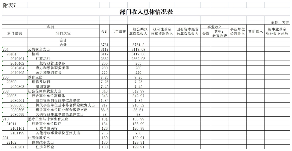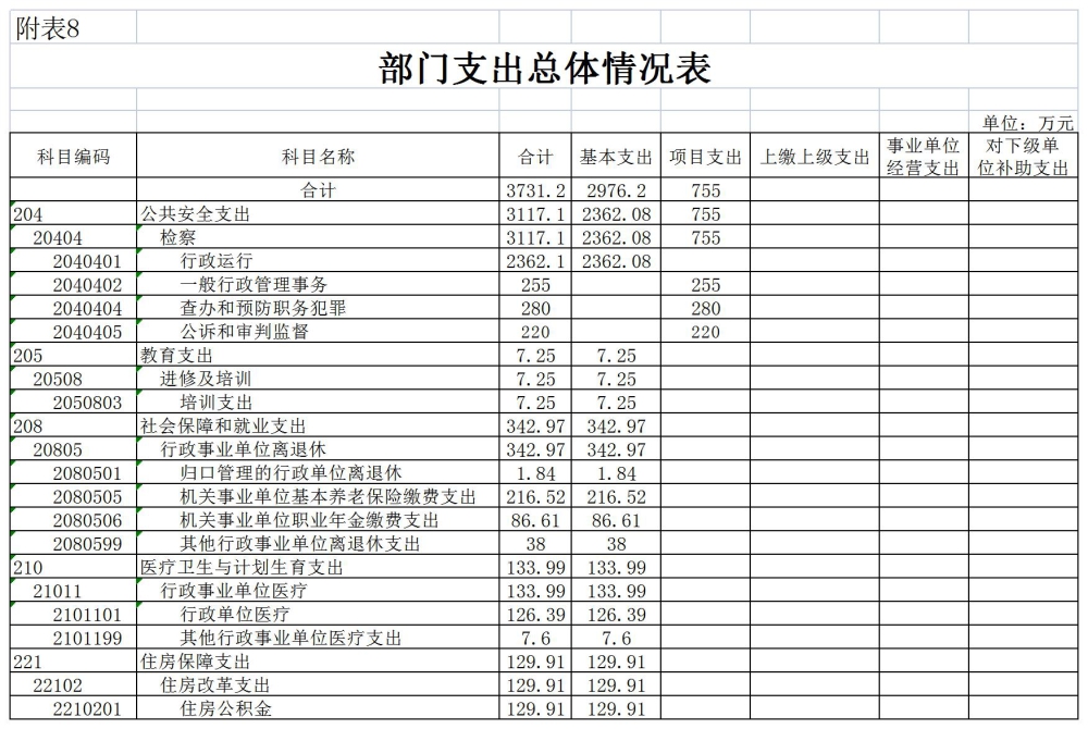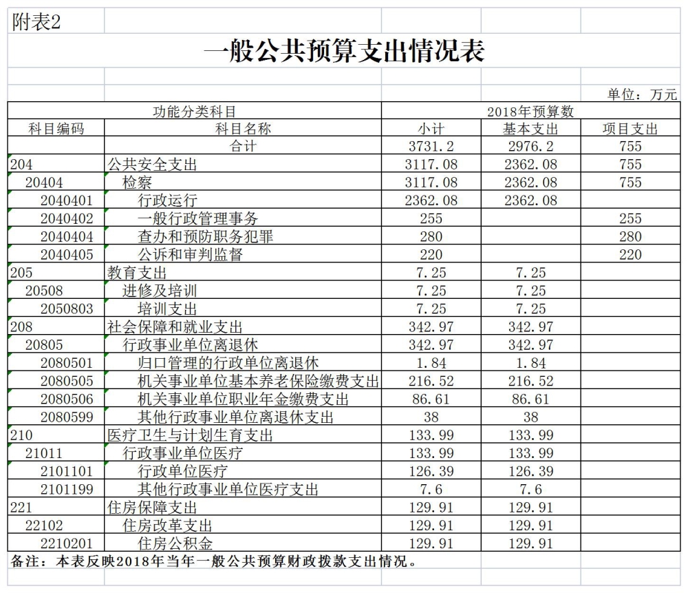 2018年一般公共预算财政拨款收入3731.2万元,一般公共预算财政拨款支出3731.2万元,比2017年减少129.24万元。其中:基本支出2976.2万元,比2017年增加34.05万元,主要原因是政策性增资及检察官员额绩效工资增资,主要用于保障在职人员工资福利及社会保险缴费,保障部门正常运转的办公费及印刷费、邮电费等各项商品服务支出;项目支出755万元,比2017年减少163.29万元,主要原因是项目支出与基本支出调整等,主要用于公诉及侦查监督案件处理、检务装备建设等重点工作。