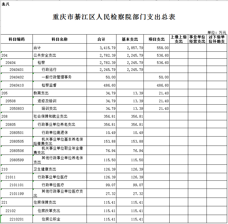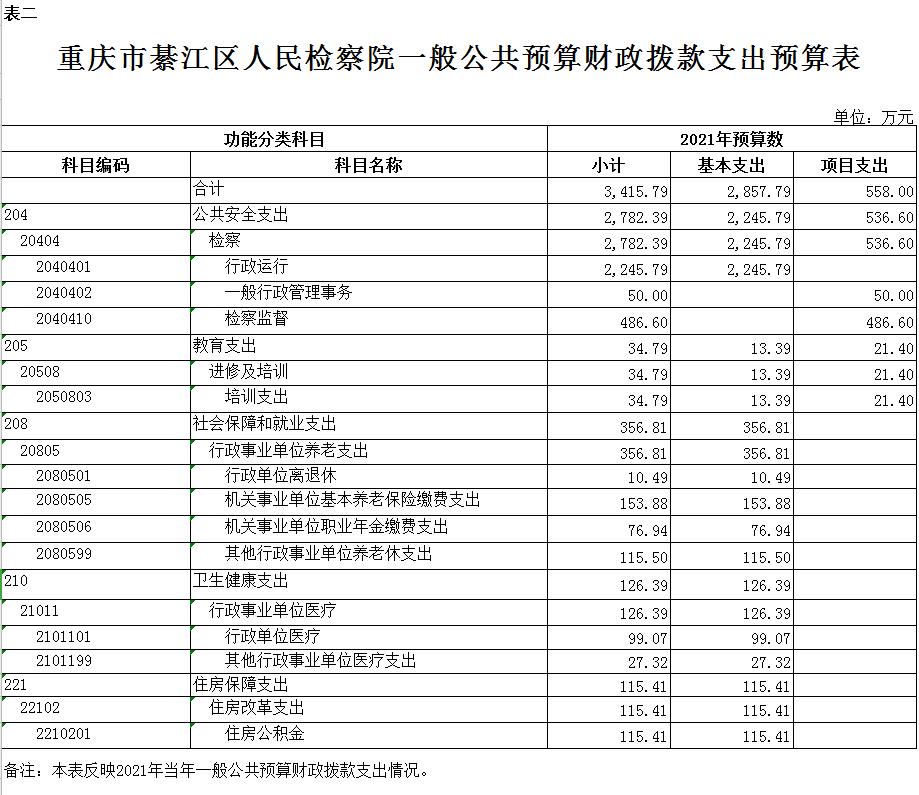 (二)支出预算:2021年年初预算数3415.79万元,其中:公共安全支出预算2782.39万元,教育支出预算34.79万元,社会保障和就业支出预算356.81万元,卫生健康支出预算126.39万元,住房保障支出预算115.41万元。支出预算较2020年增加92.91万元,主要是基本支出预算增加 116.91万元,项目支出预算减少24 万元。
