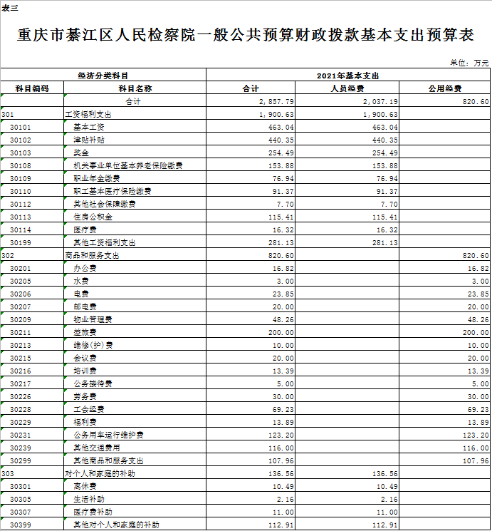 2021年一般公共预算财政拨款收入3415.79万元,一般公共预算财政拨款支出3415.79万元,比2020年增加92.91万元。其中:基本支出2857.79万元,比2020年增加116.91万元,主要原因是增人增资,主要用于保障在职人员工资福利及社会保险缴费,离休人员离休费,退休人员补助等,保障单位正常运转的各项商品服务支出;项目支出558万元,比2020年减少24万元,主要原因是按照政府要过紧日子的要求压减一般性项目支出,主要用于保障日常办案,业务装备购置和聘用制书记员薪酬保障等重点工作。