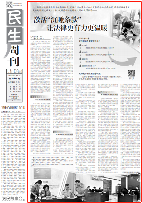 2023年2月8日,《检察日报》第5版刊登《检察机关依法履行支持起诉职能,是践行以人民为中心的发展思想的重要体现,检察实践探索让支持起诉制度焕发了生机,使弱势群体能够通过诉讼获得救济——激活“沉睡条款” 让法律更有力更温暖》一文,其中,对188体育