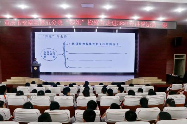 第五分院的“莎姐”检察官们来到重庆市第38中学,为300余名初二学生上了一堂主题为“远离校园暴力,走向美好未来”的法治宣讲课。重点给同学们讲述什么是校园暴力,如何应对和避免校园暴力的发生。