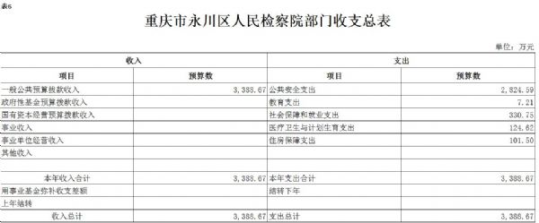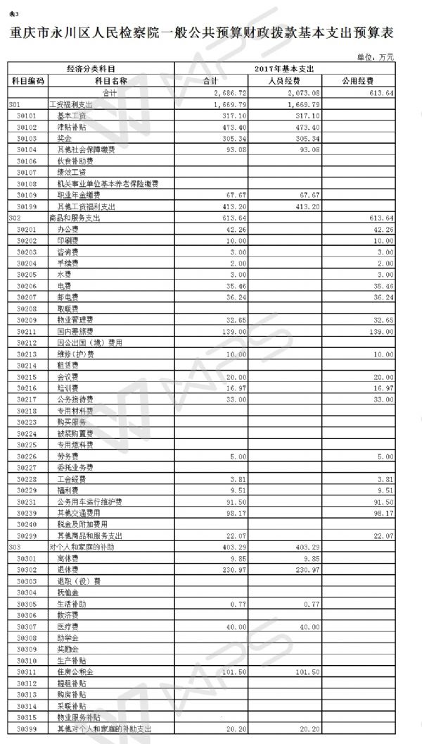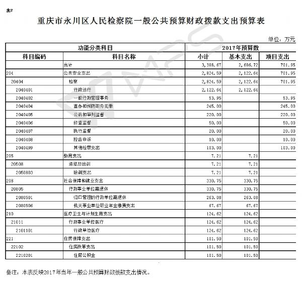 一、单位基本情况 重庆市永川区人民检察院是国家法律监督机关,内设17个职能部门。主要职能是:履行职务犯罪案件侦查、审查逮捕、审查起诉、审判活动监督、立案监督等。 二、部门预算情况说明 2017年一般公共预算财政拨款收入3388.67万元,一般公共预算财政拨款支出3388.67万元,比2016年增加541.27万元。其中:基本支出 2686.72万元,比2016年增加1162.82万元,主要原因是人员政策性增资和司法体制改革增资因素,主要用于保障在职人员工资福利及社会保险缴费、离退休人员离退休费及生活补助,保障部门正常运转的各项商品服务支出;项目支出701.95万元,比2016年减少621.55万元,主要原因是支出结构调整,主要用于查办和预防职务犯罪、公诉和审判监督、侦查监督、执行监督、控告申诉等重点工作。 2017年本单位无政府性基金收支。 三、 “三公”经费情况说明 2017年“三公”经费预算134.5万元,比2016年减少0.5万元。其中:因公出国(境)费用0万元,与上年持平;公务接待费33万元,与上年持平;公务用车运行维护费101.5万元,比2016年减少0.5万元, 减少主要原因是健全了公务用车制度,加强了日常细节管理。2016年,我单位认真贯彻落实中央关于厉行节约的各项要求,制定相关财务管理制度,严格控制“三公”经费开支。 四、其他重要事项的情况说明 1、部门运行经费情况。2017年一般公共预算财政拨款运行经费613.64万元,主要用于办公费、印刷费、邮电费、差旅费及其他商品和服务支出等。 2、政府采购情况。2017年政府采购预算总额50万元,其中:政府采购货物预算50万元。 3、绩效目标设置情况。2017年项目支出实行了绩效目标管理,涉及一般公共预算财政拨款701.95万元。