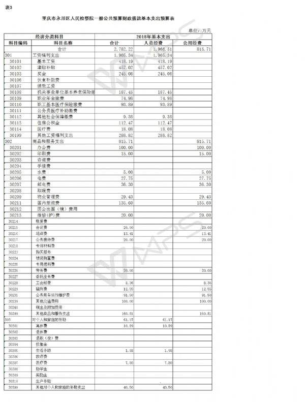 2018年一般公共预算财政拨款收入3312.22万元,一般公共预算财政拨款支出3312.22万元,比2017年减少76.45万元。其中:基本支出2782.22万元,比2017年增加95.5万元,主要原因是人员政策性增资和支出结构调整,主要用于保障在职人员工资福利及社会保险缴费,离休人员离休费及生活补助,保障部门正常运转的办公费及印刷费、邮电费等各项商品服务支出;项目支出530万元,比2017年减少171.95万元,主要原因是支出结构调整,主要用于公诉和审判监督、侦查监督、执行监督、控告申诉等重点工作。