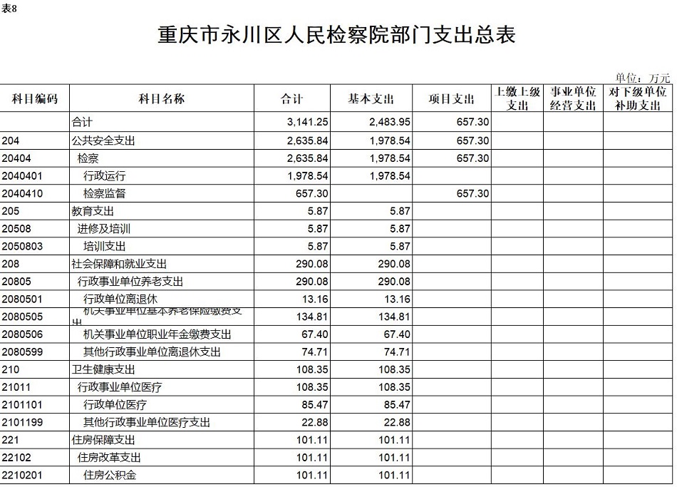 (二)支出预算:2020年年初预算数3141.25万元,其中:公共安全支出预算2635.84万元,教育支出预算5.87万元,社会保障和就业支出预算290.08万元,卫生健康支出预算108.35万元,住房保障支出预算101.11万元。支出预算较去年减少123.6万元,主要是基本支出预算减少365.45万元,项目支出预算增加241.85万元。