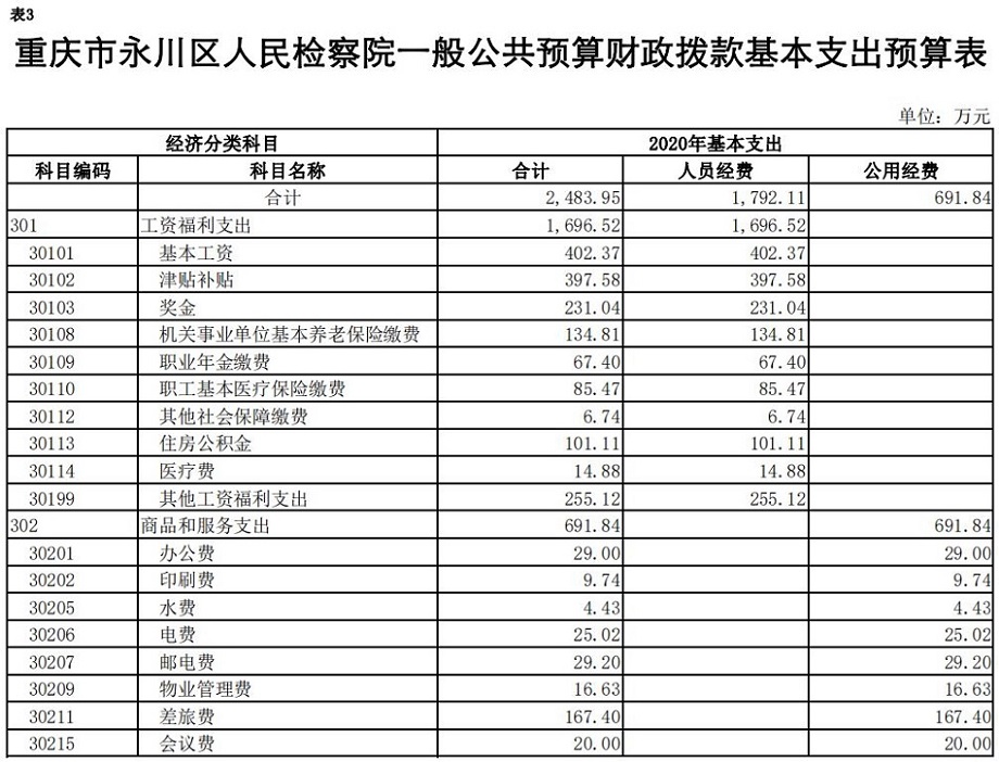 2020年一般公共预算财政拨款收入3141.25万元,一般公共预算财政拨款支出3141.25万元,比2019年减少123.6万元。其中:基本支出2483.95万元,比2019年减少365.45万元,主要原因是监察体制改革转隶人员划转,其相应的人员经费、日常公用经费预算减少,主要用于保障在职人员工资福利及社会保险缴费,离休人员离休费,退休人员补助等,保障部门正常运转的各项商品服务支出;项目支出657.3万元,比2019年增加241.85万元,主要原因一是2020年增加了办案区改造一次性项目,二是提高了年初预算到位率,主要用于公诉和审判监督、侦查监督、公益诉讼、执行监督、控告申诉、办案区改造等重点工作。