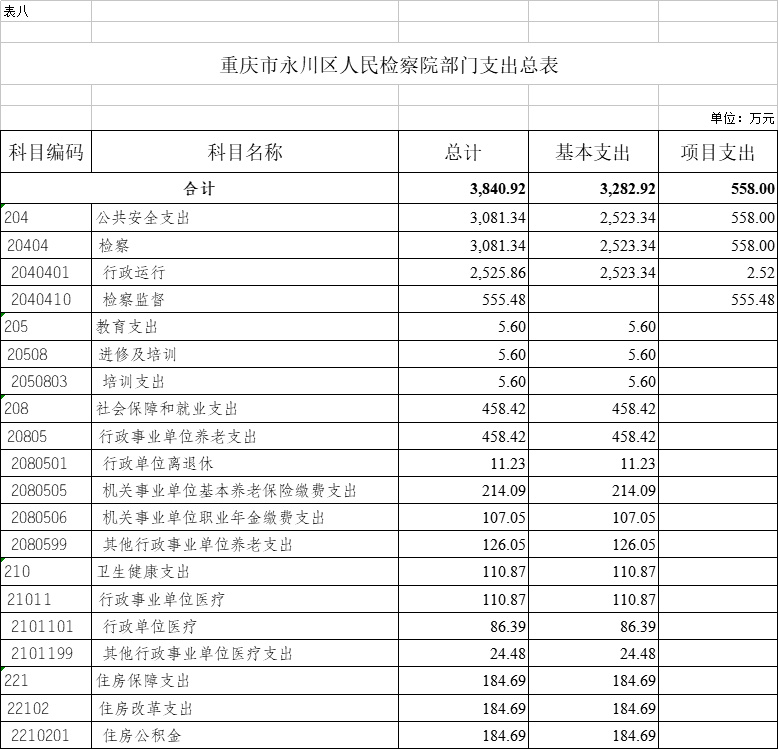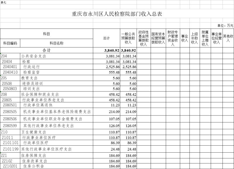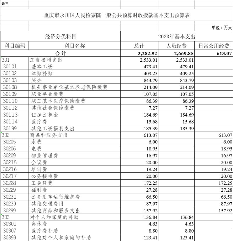 2023年一般公共预算财政拨款收入3840.92万元,一般公共预算财政拨款支出3840.92万元,比2022年增加263.03万元。其中:基本支出3282.92万元,比2022年增加754.83万元,主要原因一是聘用制书记员项目经费转入人员经费170万元,二是行政参公单位公用经费综合定额人均减少1万元,预算减少96万元,三是规范公务员津贴补贴改革后,公务员基础绩效奖和年度考核奖纳入年初预算编制,养老保险、职业年金和住房公积金计提基数调整,年终一次性奖金、未休假补贴规范编制等,共计增加655万元,主要用于保障在职人员工资福利及社会保险缴费、离休人员离休费、退休人员补助等,保障部门正常运转的各项商品服务支出;项目支出558万元,比2022年减少491.8万元,主要原因一是聘用制书记员项目经费转入人员经费170万元,二是一次性项目减少345万元,主要用于公诉和审判监督、公益诉讼、执行监督、控告申诉等重点工作。