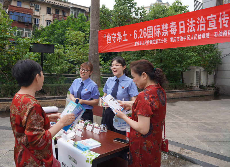 第五分院、渝中区人民检察院的检察官们依托“平安渝中”网格接待日平台,在石油路街道彭家花园社区支起了禁毒“摊位”,主动向社区群众派发宣传手册、图文并茂讲解禁毒知识,普及禁毒法律法规,引导群众抵制毒品、珍爱生命。