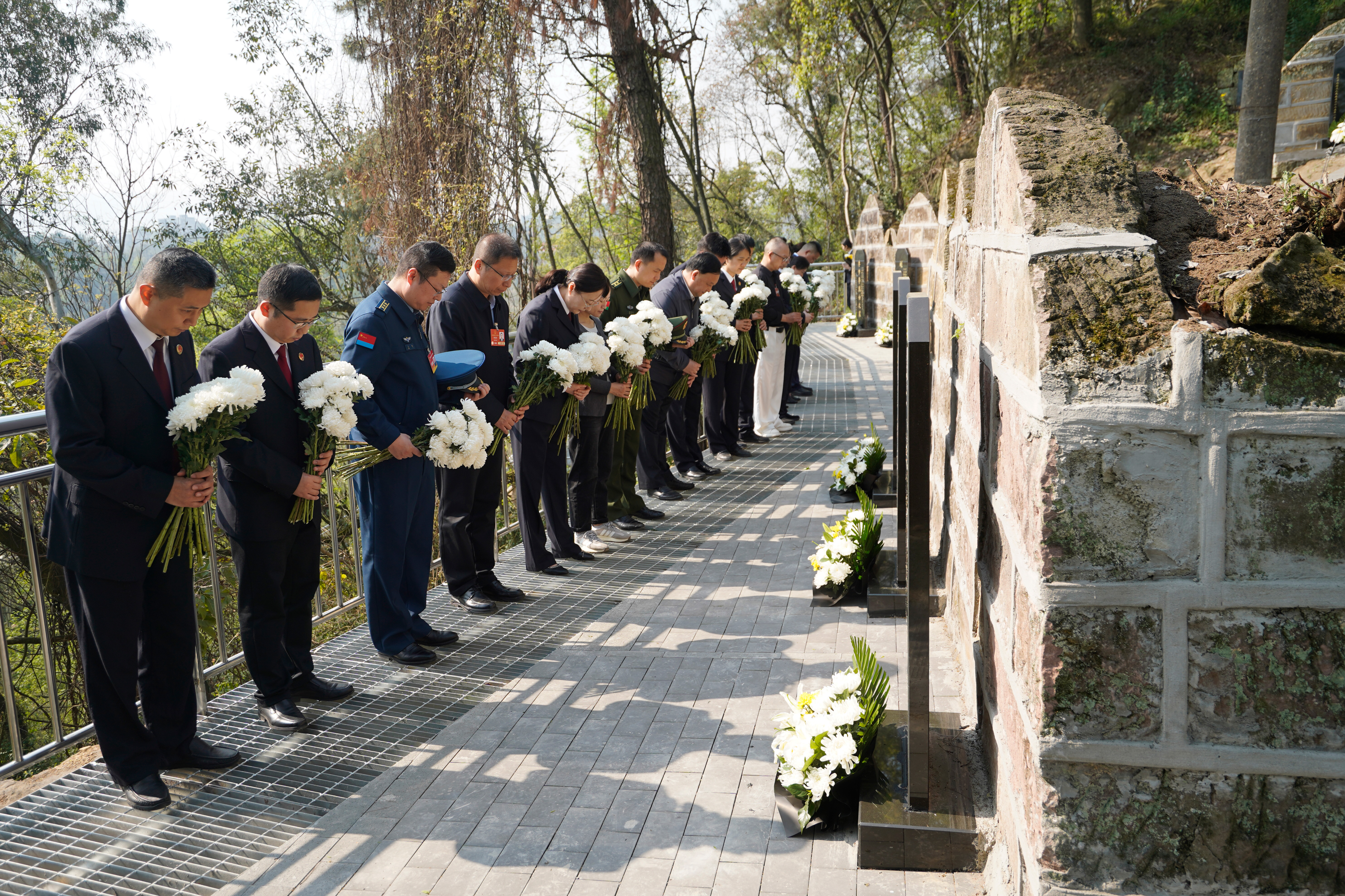 3月27日,北碚区检察院邀请全国人大代表、中国船舶集团首席技师傅国涛,市人大代表、空军某部队上校主任王屹以及解放军成都军事检察院、区退役军人事务局等有关单位领导共同对金刚碑零散烈士集中安葬点整改情况进行“回头看”,并向英烈敬献花篮。