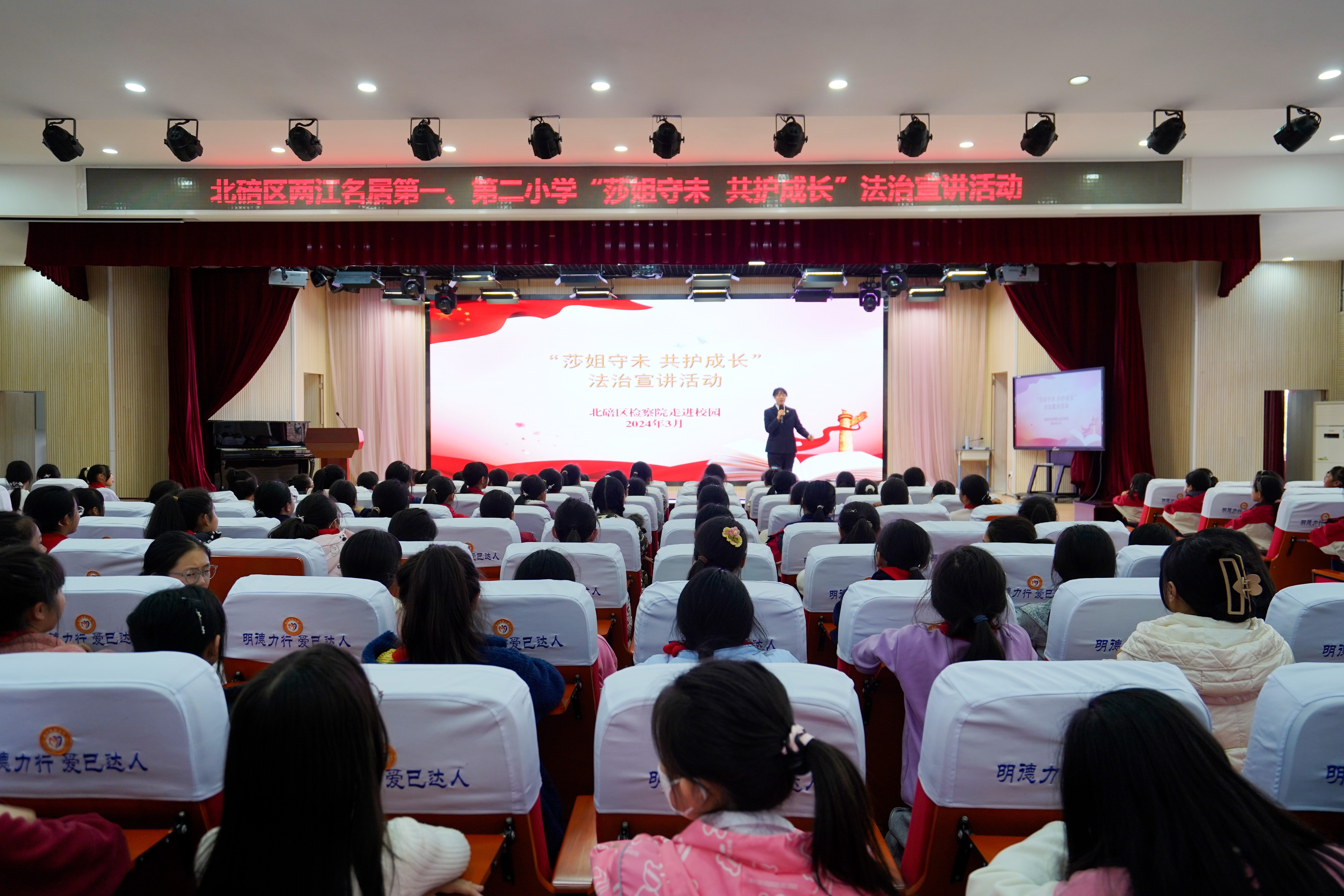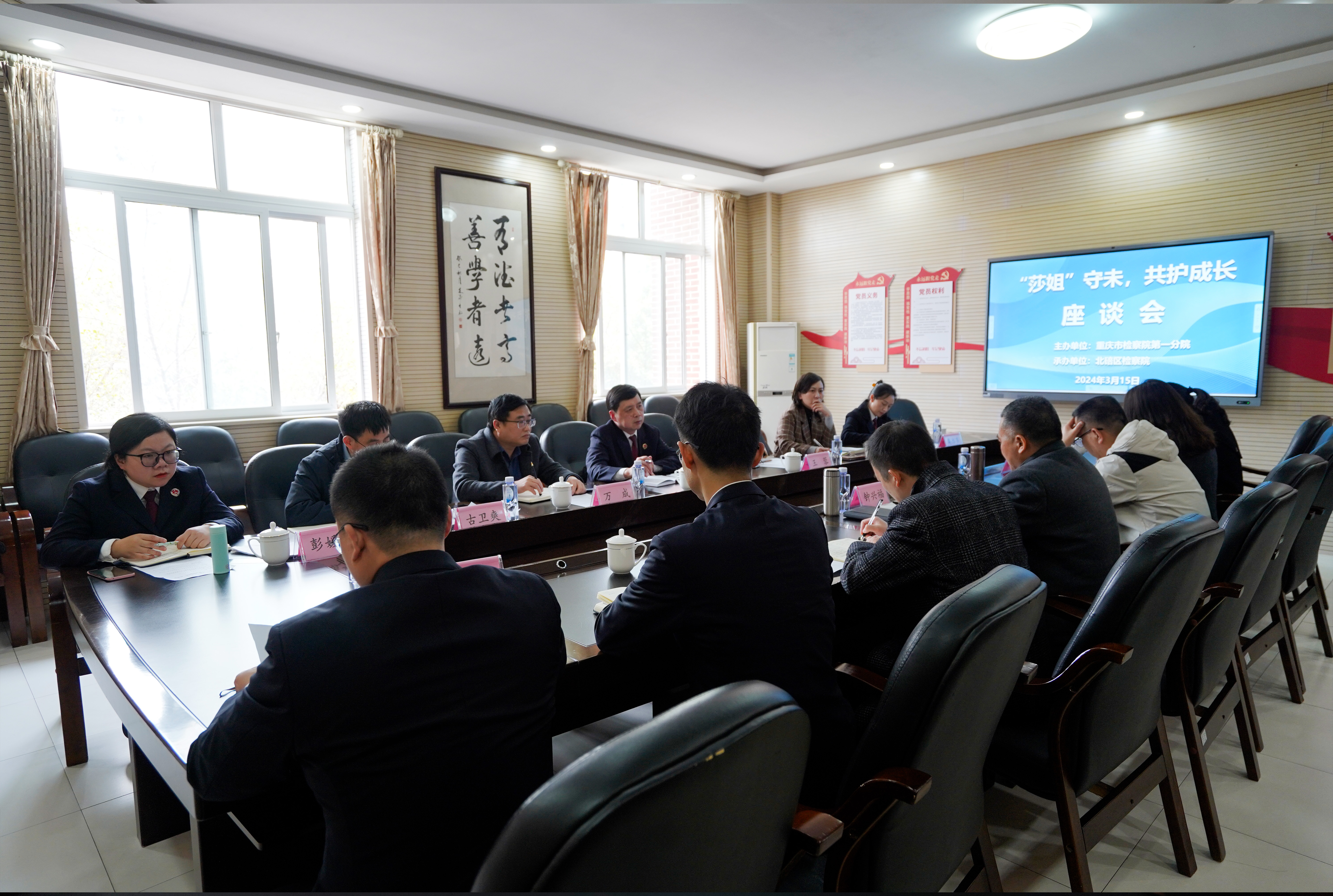 第一分院(以下简称一分院)主办、北碚区检察院承办的“莎姐守未 共护成长”座谈会在北碚区蔡家岗街道两江名居第一小学举行。一分院检察七部(未检部门)主任潘强、北碚区政法委副书记王蓉、北碚区检察院党组成员、分管院领导古卫爽,北碚区教委副主任万成、北碚区蔡家岗街道副主任廖丹青、北碚区人大代表白莎出席会议。