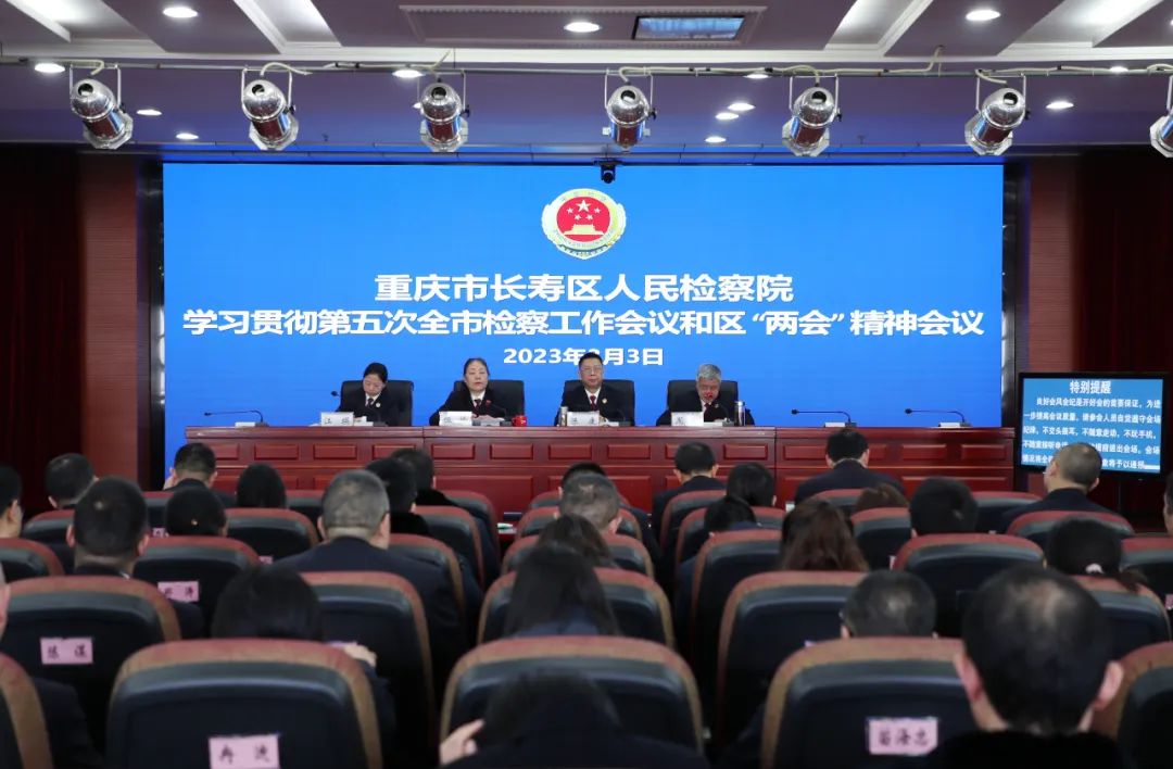 近日,长寿区检察院召开全院干警职工大会学习贯彻第五次全市检察工作会议精神,并安排部署贯彻落实举措。全体院领导、干警、聘用制书记员和文职人员参加会议。