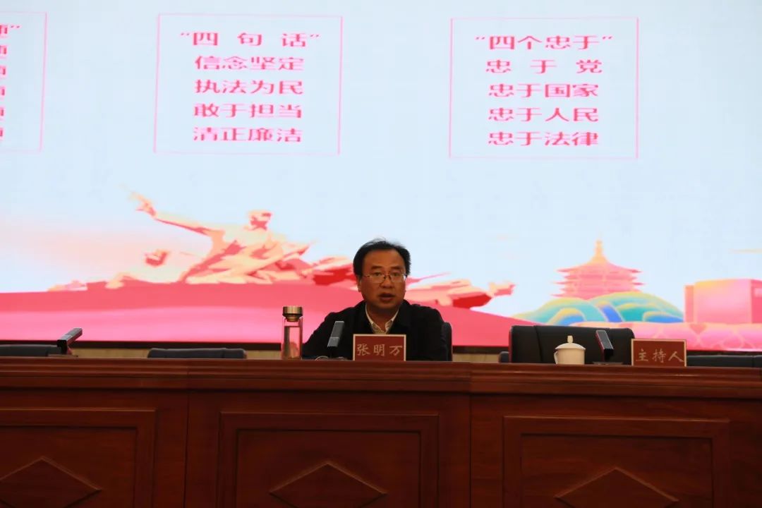 报告结束后,张明万以“学习贯彻习近平新时代中国特色社会主义思想 锻造新时代政法铁军”为主题,围绕习近平总书记对政法队伍提出的“五个过硬”要求讲专题党课。他指出,落实好“五个过硬”,是锻造新时代忠诚干警担当政法铁军的魂、根和本。一是政治过硬。政法干部干警必须把政治忠诚作为第一要求,把旗帜鲜明讲政治作为第一标准,把“坚持党的绝对领导”作为政法工作的最高原则。二是业务过硬。政法机关工作具有高负荷、高对抗、高压力、高风险等特点,需要政法干警既要政治过硬又要本领高强,提升“八个方面”执政本领。三是责任过硬。政法干部干警要做到敢于斗争、勇于担当、善于落实,履行好“维护国家政治安全、确保社会大局稳定、促进社会公平正义”这四大职责使命。四是纪律过硬。政法队伍本质上是纪律部队,广大干警要将遵守纪律铭刻在灵魂中,牢记法律红线不可逾越,以铁的纪律带出一支铁的队伍。五是作风过硬。政法干警要严格约束个人生活作风和职业操守,坚持做人、处事、用权底线,慎独慎初慎微慎欲,增强拒腐防变的免疫力。