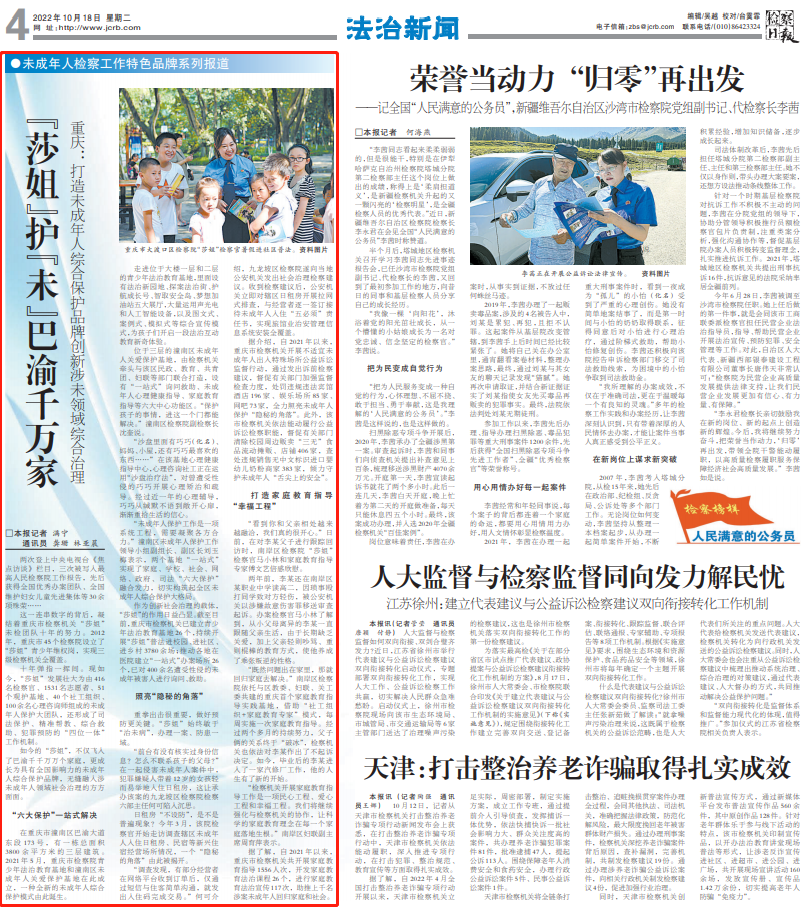 2022年10月18日,《检察日报》第4版“未成年人检察工作特色品牌系列报道”专栏刊登《“莎姐”护“未”巴渝千万家——重庆:打造未成年人综合保护品牌创新涉未领域综合治理》一文,内容如下:
