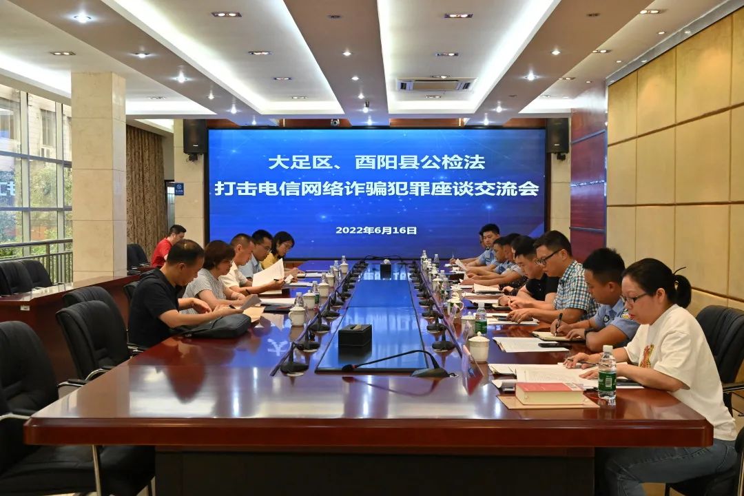 为加强区域部门交流协作、共同提升办案质效,近日,大足区、酉阳县公检法机关召开打击电信网络诈骗犯罪座谈交流会。酉阳县副县长、县公安局党委书记、局长旷陈,酉阳县检察院党组书记、检察长刘少谷,大足区公安局党委委员、副局长罗存伟出席会议,大足区检察院党组成员、副检察长彭雯主持会议。