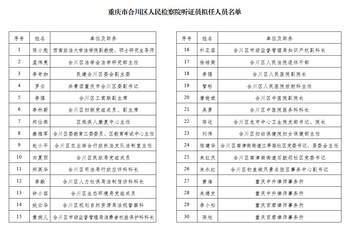 根据《重庆市合川区人民检察院听证员选任方案》,经研究决定,拟选任陈小彪等30名同志为重庆市合川区人民检察院听证员人选。为充分发扬民主,广泛接受监督,现将名单予以公示,公示期为5个工作日(2022年6月16日至2022年6月22日).