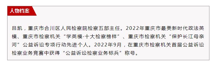 “以司法力量守护好合川三江六岸,让家乡河生机永续,是我的职责担当。”作为一名公益诉讼检察官,吕凯用3年时间几乎走遍合川200多条河流,所在部门办理群众反映强烈的环境污染、食品药品安全等领域公益诉讼案件180余件。