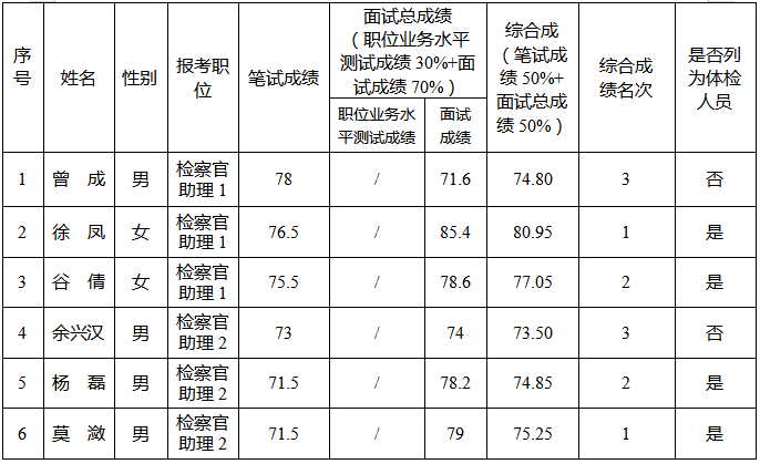 一、面试总成绩和进入体检人员名单