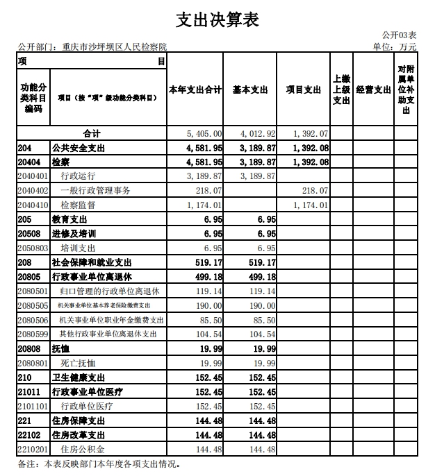 3.支出情况。2019年度支出合计5,405万元,较上年决算数增加114.1万元,增长2.16%,主要原因是2018年度中央政法专款支出了一部分。其中:基本支出4,012.92万元,占74.24%;项目支出1,392.07万元,占25.76%。
