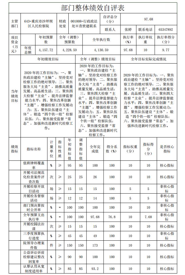 本单位整体绩效自评综述:根据年初设定的绩效目标,部门整体完成情况较好。全年(调整)预算数为4228.59万元,全年执行数为4130.59万元,完成预算的97.68%.