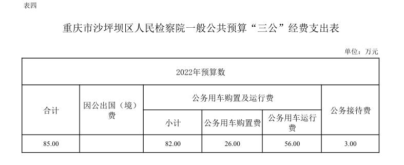 2022年“三公”经费预算85万元,与上年持平。其中:因公出国(境)费用0万元,与上年持平;公务接待费3万元,比2021年减少2万元,主要原因是严格控制接待规模和人员,把控接待标准,压缩接待支出;公务用车运行维护费56万元,比2021年减少24万元,主要原因是厉行节约,严格控制公务用车运行维护费支出;公务用车购置26万元,比2021年增加26万元,主要原因是本单位大多车辆已完成折旧,维修成本高,拟新购执勤执法用车1辆。